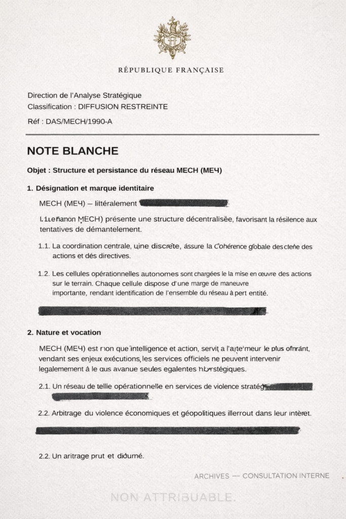 Le MECH y apparaît comme une structure hybride, opérant entre intérêts privés et besoins stratégiques inavouables. Pas une idéologie. Un service. Une offre. Un prestataire de l’ombre capable d’agir là où les États préfèrent détourner le regard.